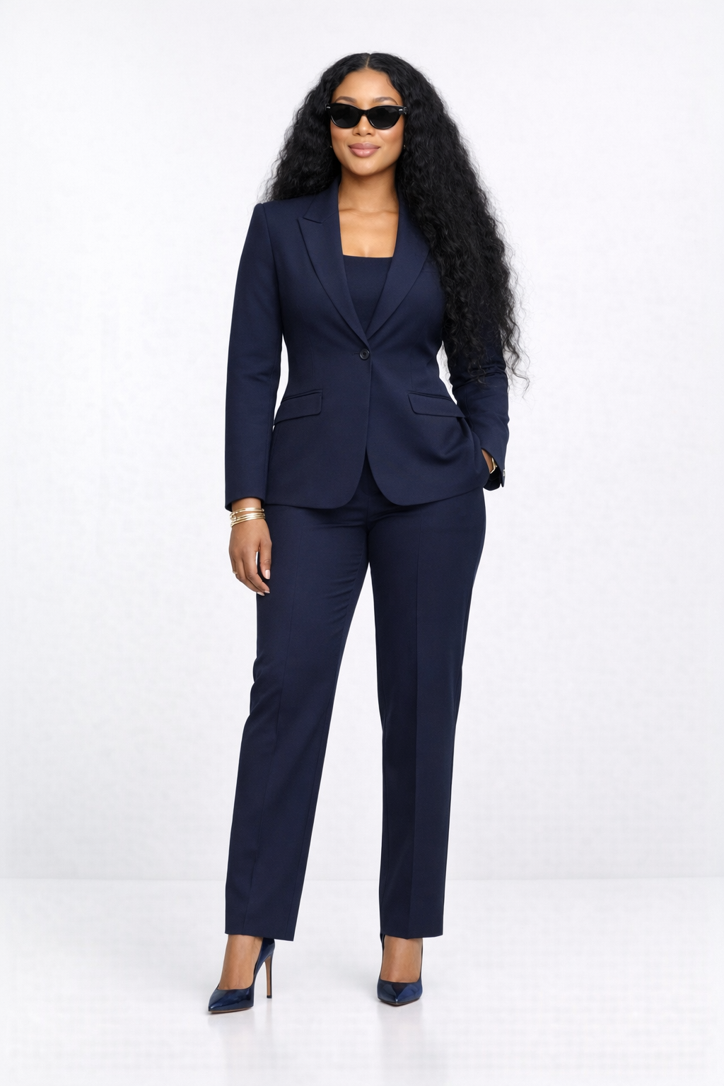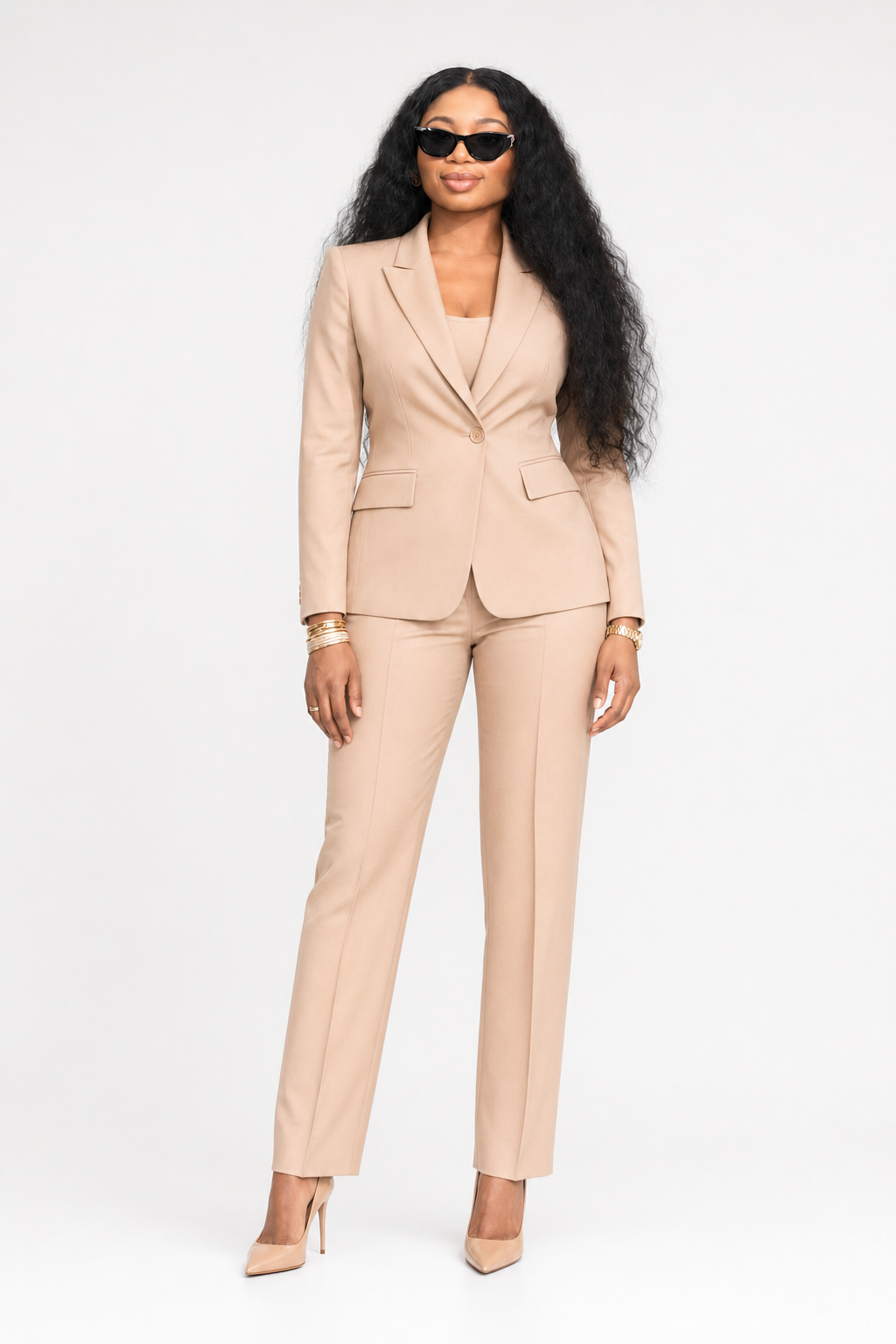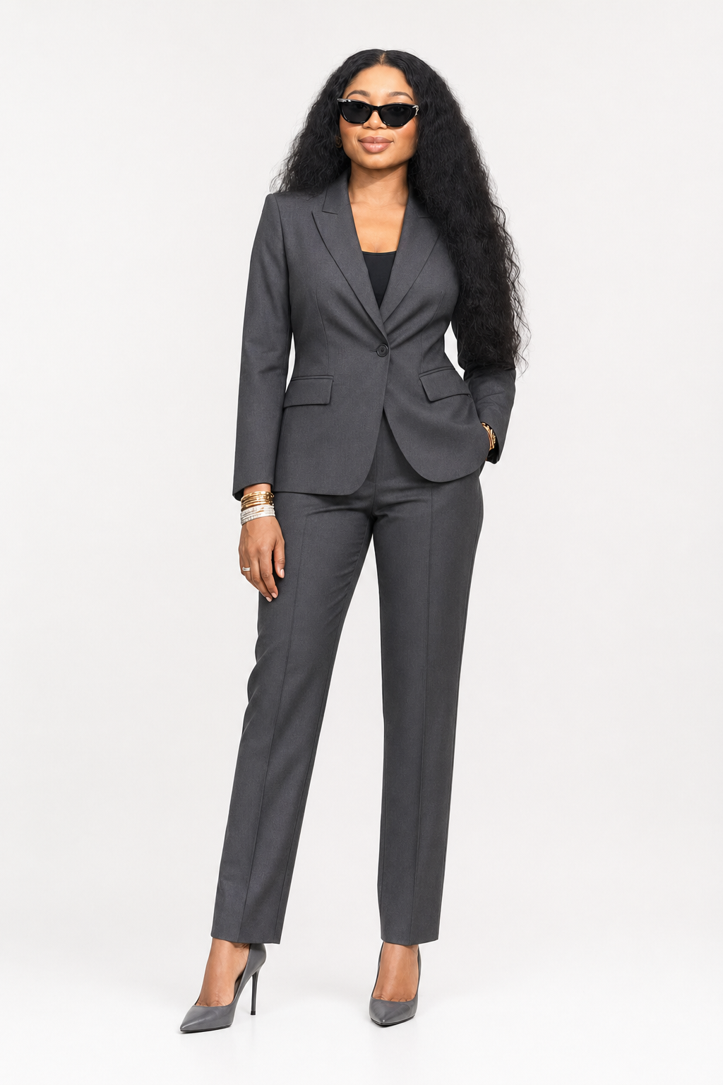 A timeless structured blazer and trouser suit crafted from premium suiting fabric. The clean, architectural lines and impeccable tailoring create a look of effortless authority. A wardrobe essential for every professional woman.
