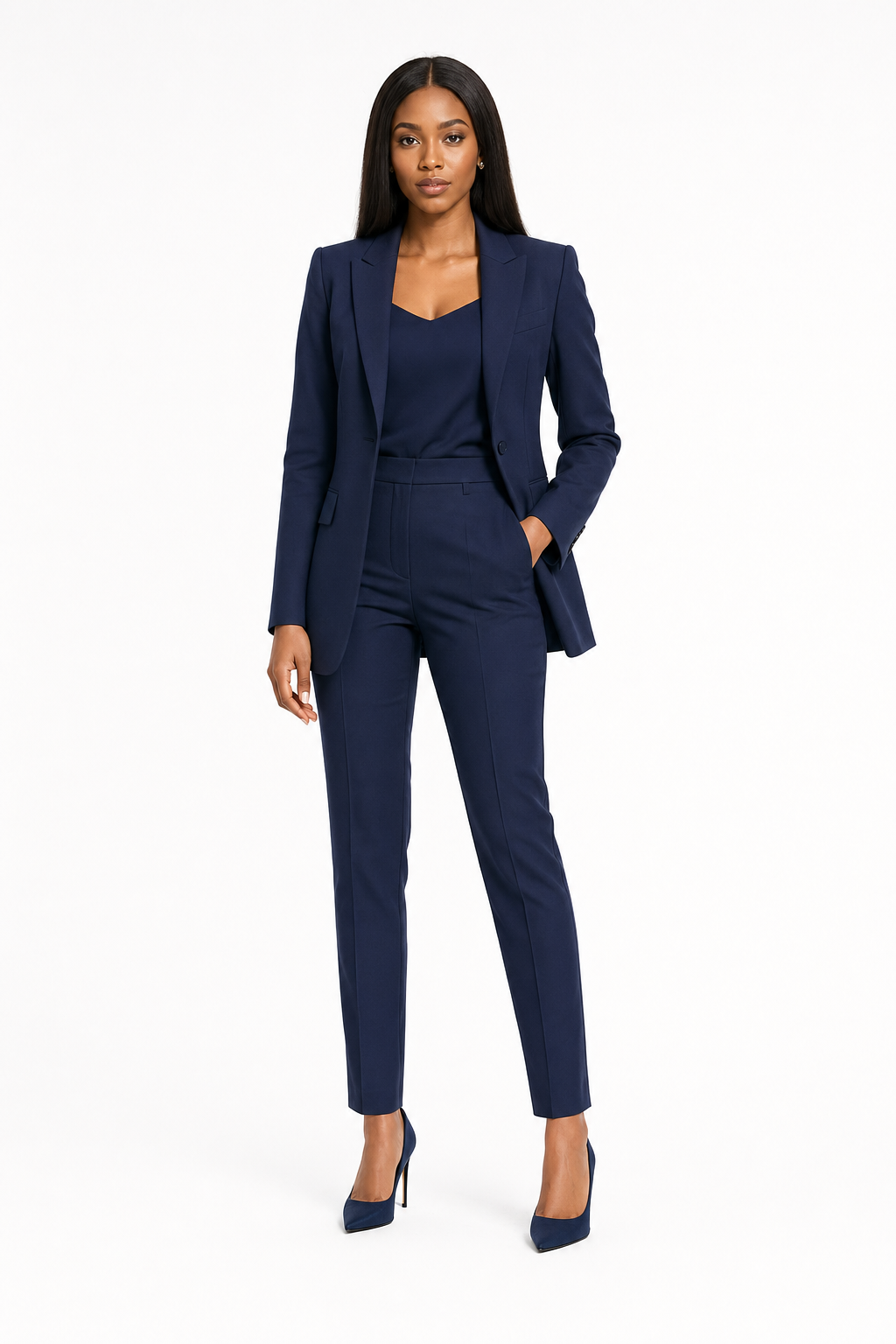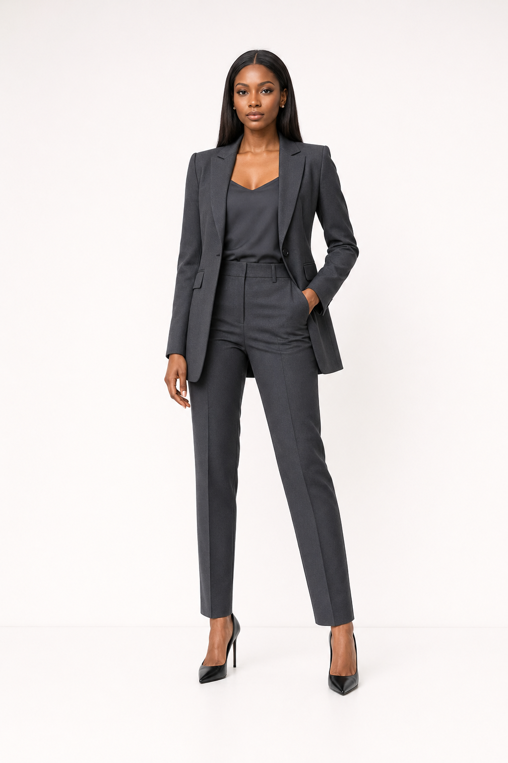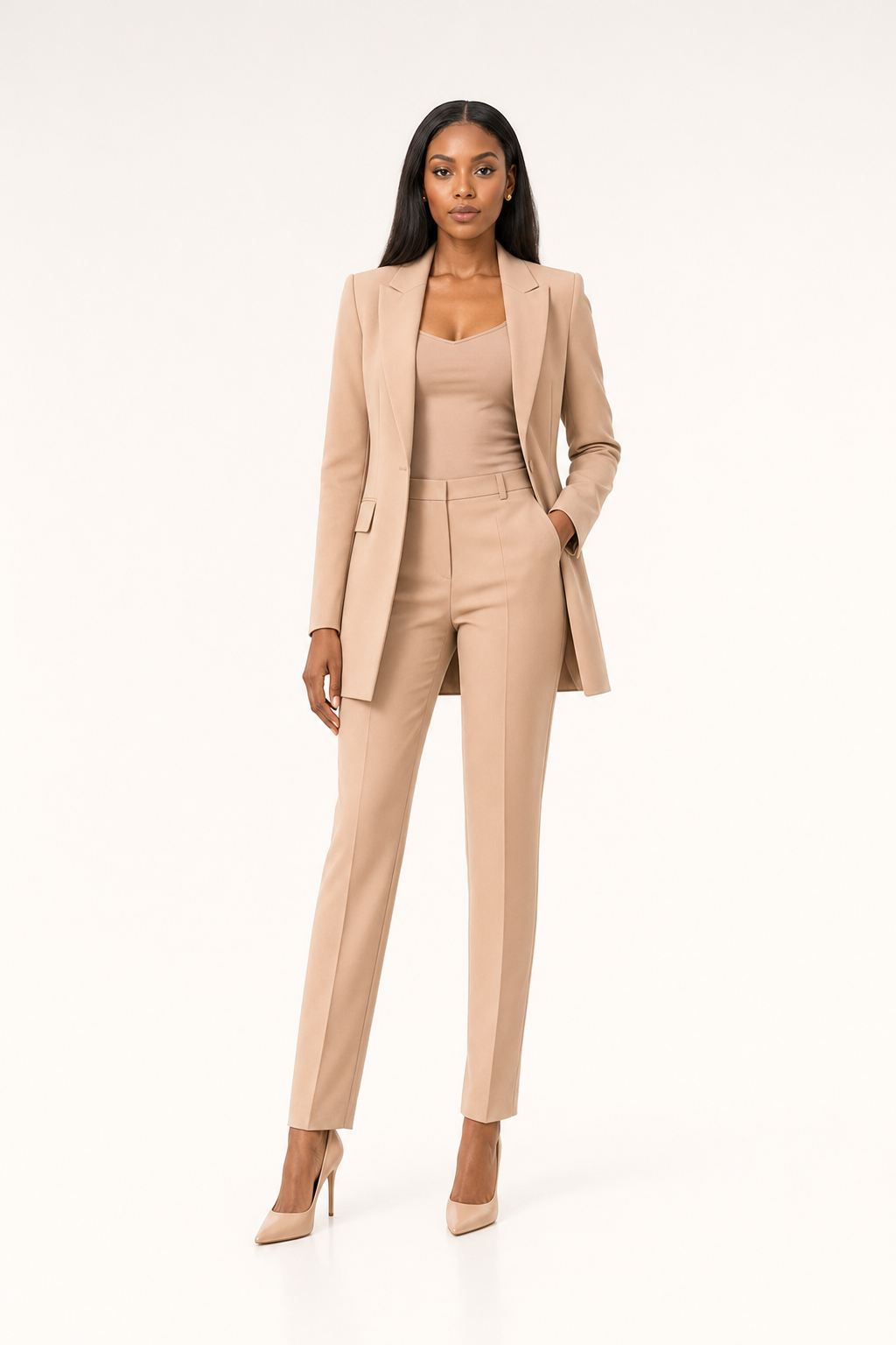 A fashion-forward corporate look featuring a longline structured blazer paired with slim-cut tailored trousers. The elongated blazer creates a sleek, editorial silhouette that is both modern and professional. A statement piece for the style-conscious executive.