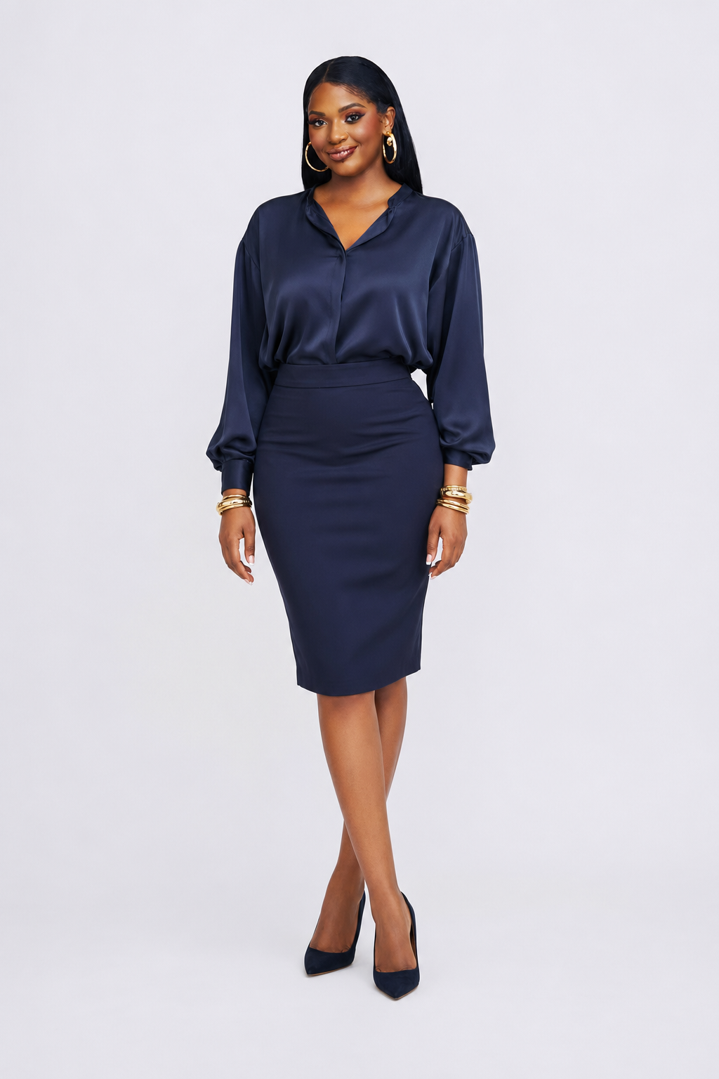 An elegant silk blouse and pencil skirt set that combines luxurious fabric with professional tailoring. The fluid silk blouse drapes beautifully while the structured pencil skirt creates a polished, complete look.