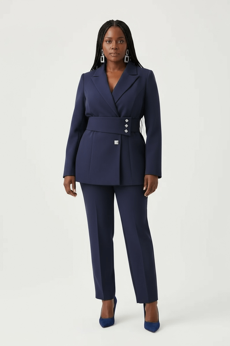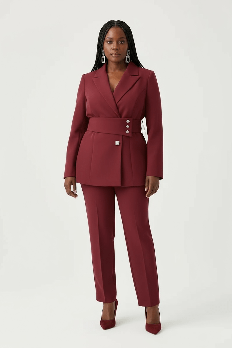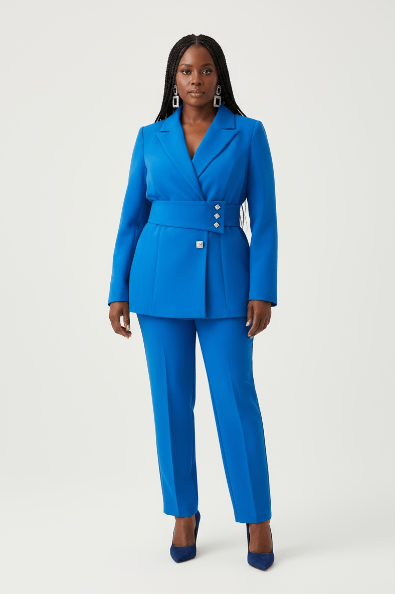 A commanding two-piece set built for the modern professional. The structured blazer features clean lapels and a tailored silhouette, while the matching high-waist trousers offer a long, elegant line. Crafted in premium suiting fabric for all-day confidence. Available in multiple colourways. UK sizing.
